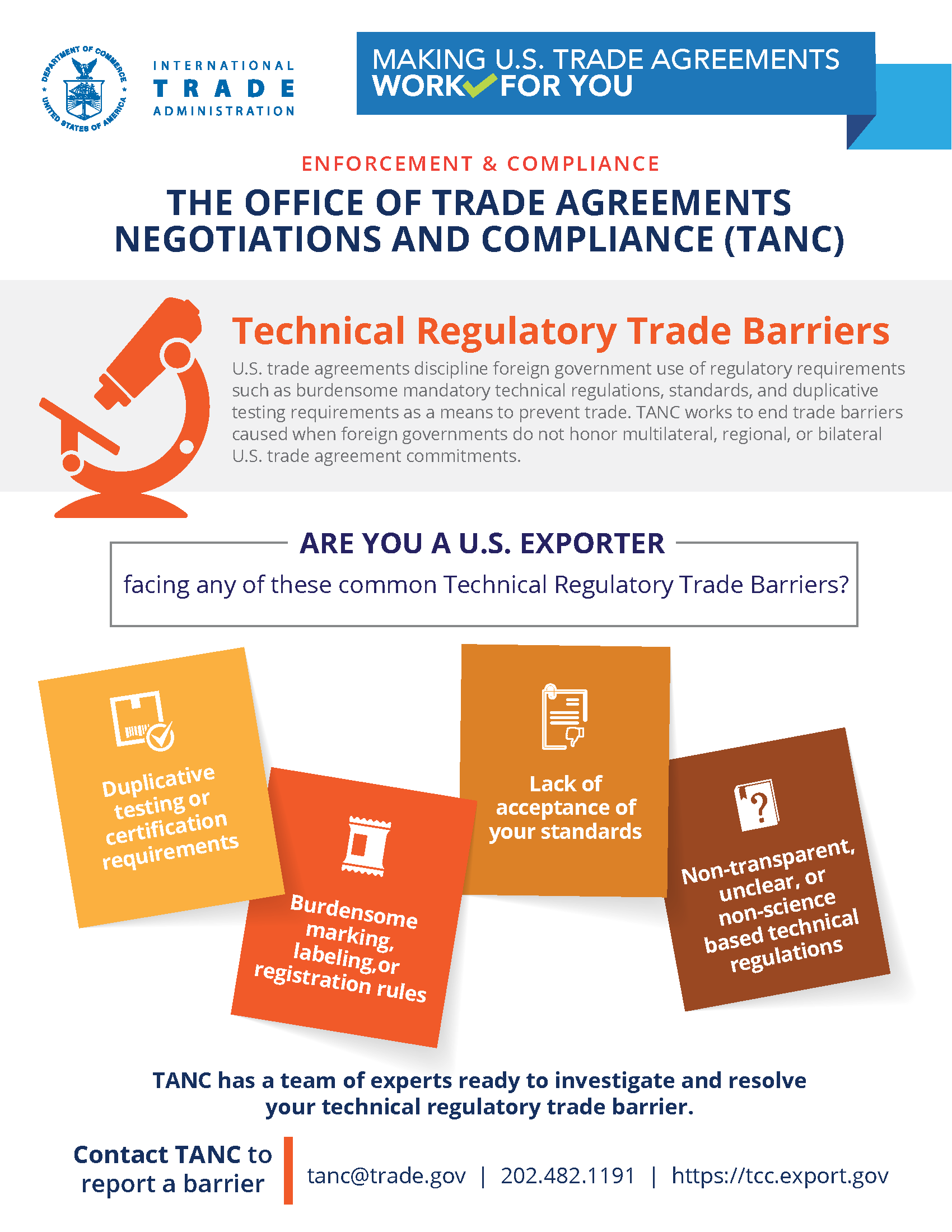 An infographic describing in plain English how to recognize when an exporter is facing a Technical Regulatory barrier.s.