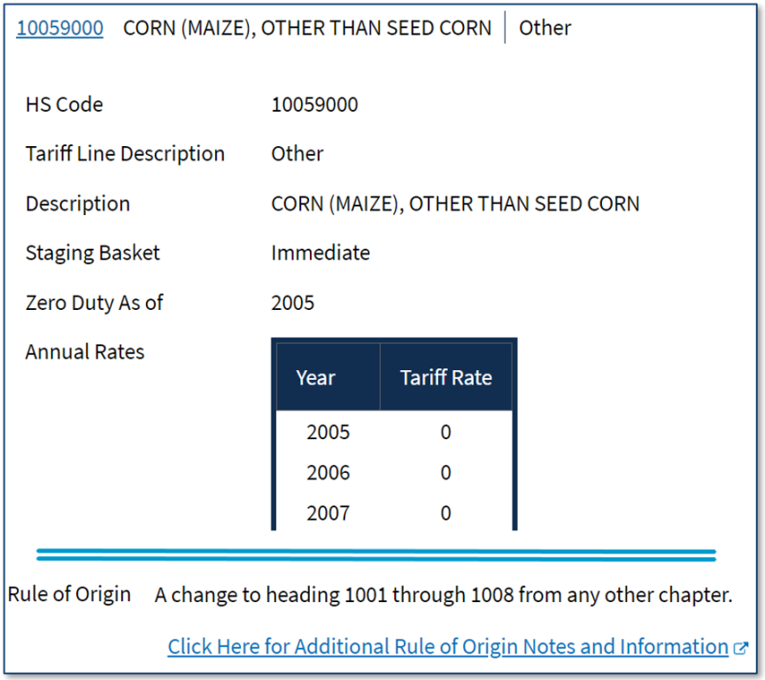 Once you click on a product, the full HS code, description, staging basket, and product-specific rules of origin of the product are displayed.