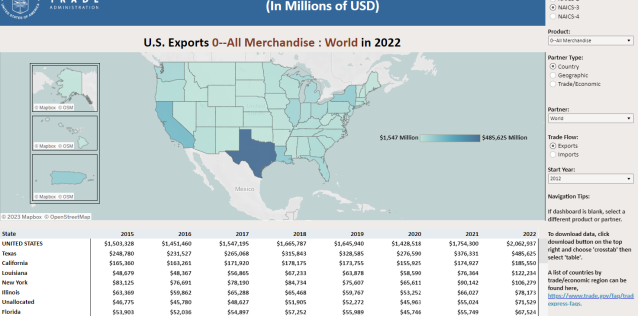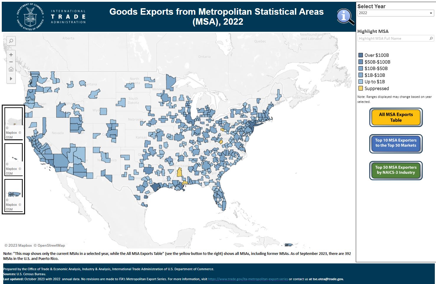 Interactive dashboards and infographics providing data on U.S. goods trade at the national, state and metropolitan area levels.